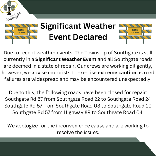 Due to recent weather events, The Township of Southgate is still currently in a Significant Weather Event and all Southgate roads are deemed in a state of repair. Our crews are working diligently, however, we advise motorists to exercise extreme caution as road failures are widespread and may be encountered unexpectedly.