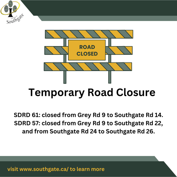 SDRD 57: closed from Grey Rd 9 to Southgate Rd 22, and from Southgate Rd 24 to Southgate Rd 26.